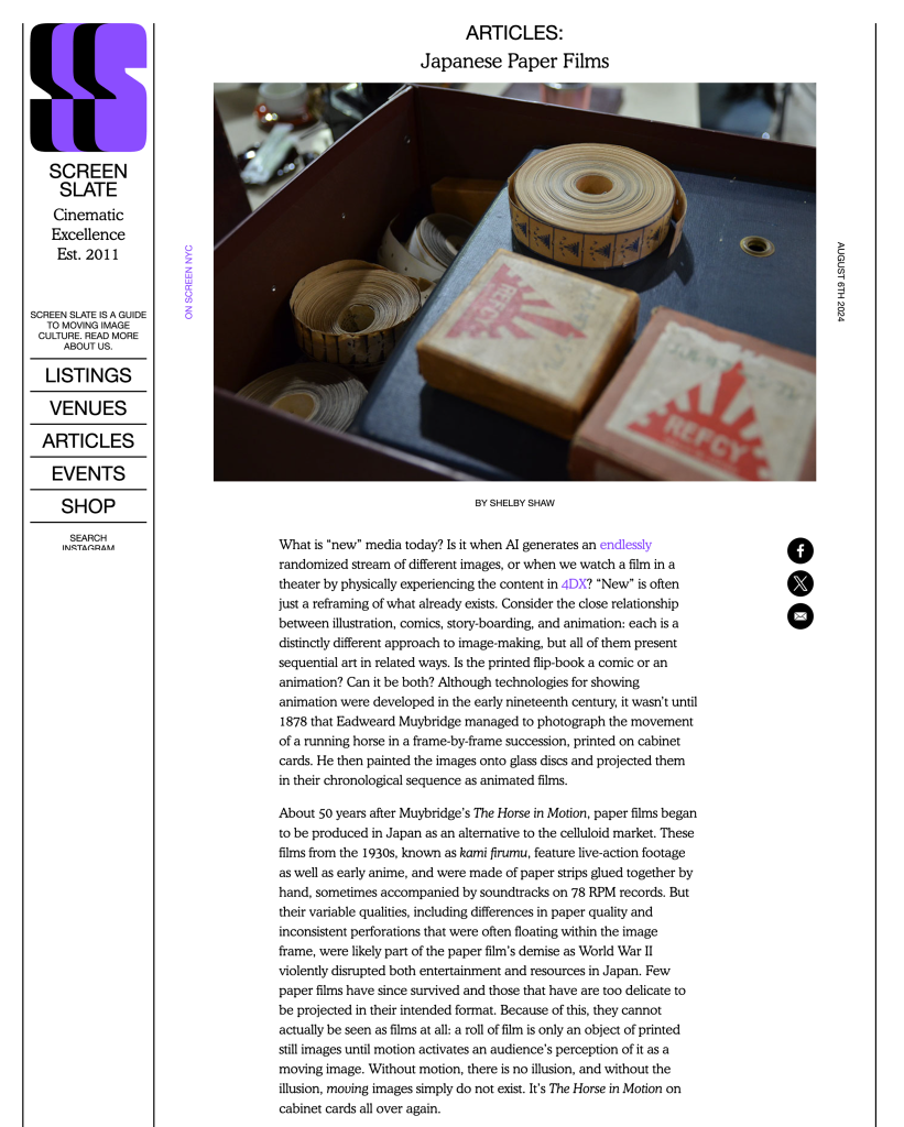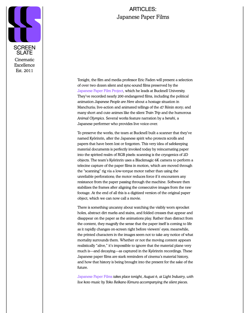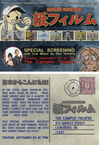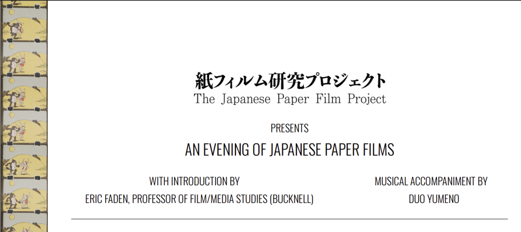 Recommend tag line: “Come by car, boat, train, hot air balloon, turtle, tanuki, horse, motorcycle, skis, rocket or just run but get yourself to the Japanese Paper Film screening at [venue/time/date]. #kamifirumu”